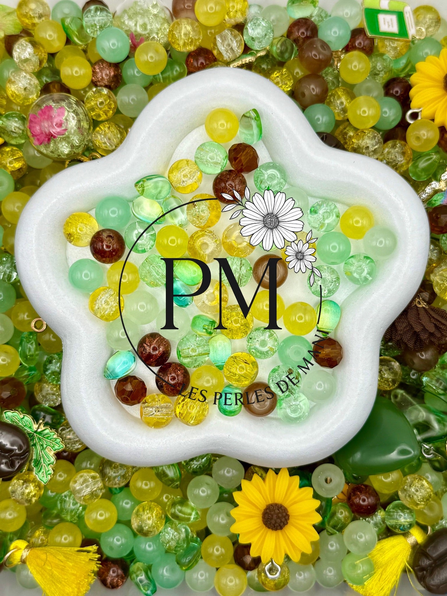 Ce mélange se compose de magnifiques perles en verre craquelé dans de superbes nuances de vert, jaune et brun, rappelant la fraîcheur de la nature et la chaleur du soleil. Il est complété par des perles unies vertes et jaunes en 8 mm et 10 mm, ainsi que par des perles à facettes qui ajoutent éclat, relief et profondeur à l’ensemble.