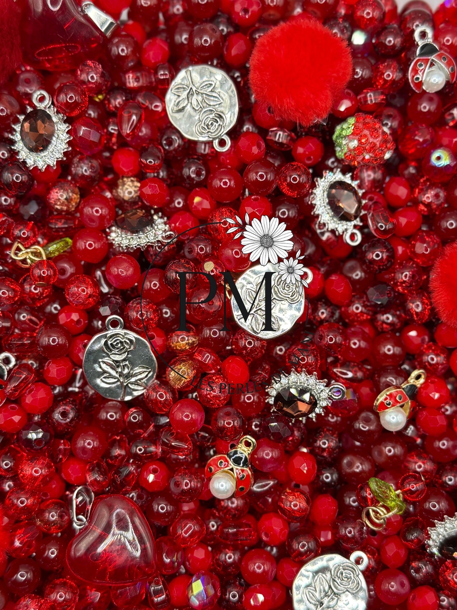 Ce mélange dévoile de somptueuses perles en verre craquelé aux nuances profondes de rouge, évoquant passion et mystère.