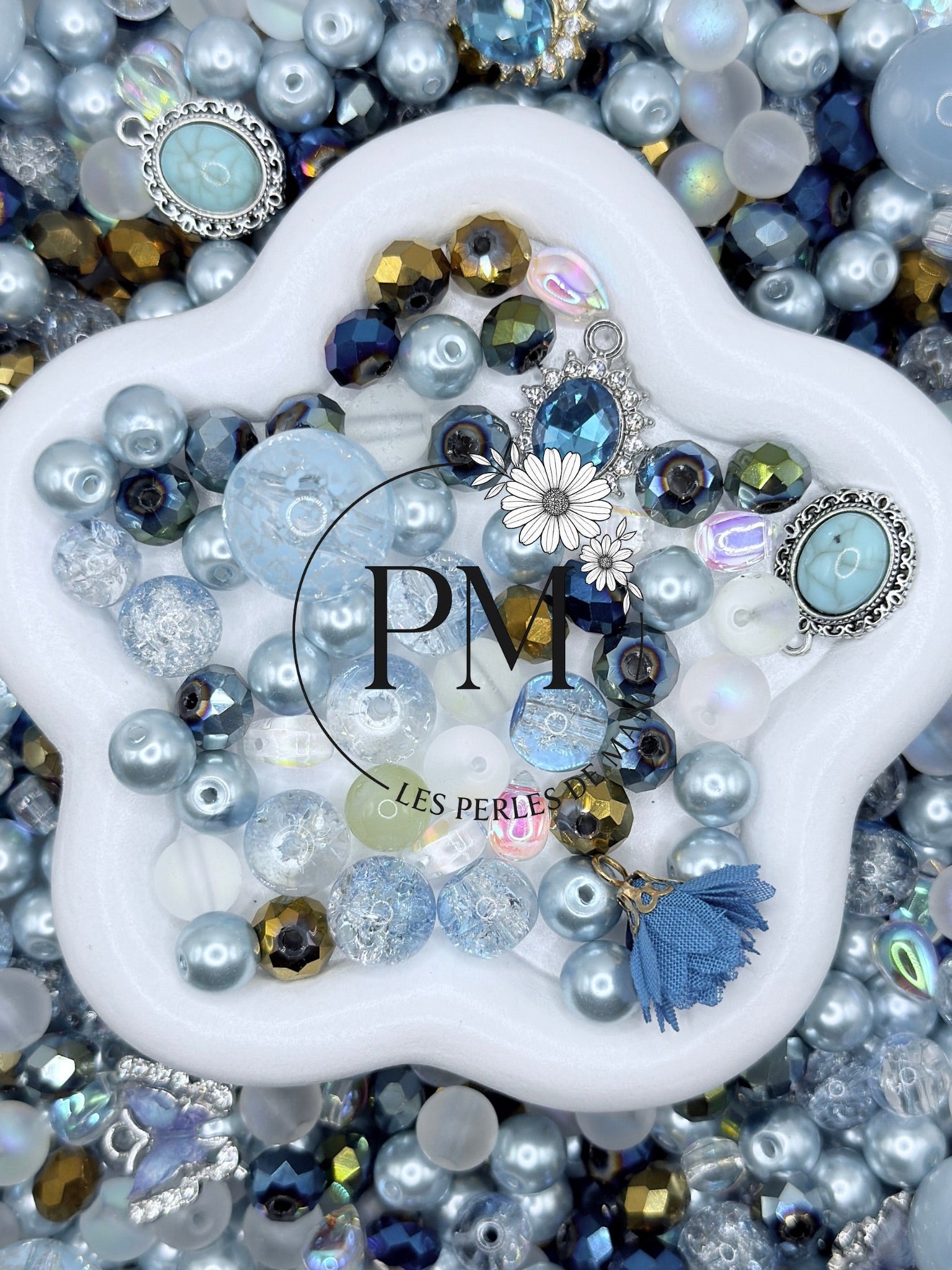 Ce mélange dévoile de superbes perles aux nuances de bleu glacier, bleu pastel et bleu argenté, associées à des perles transparentes, nacrées et craquelées, évoquant la pureté de l’eau et la lumière cristalline.