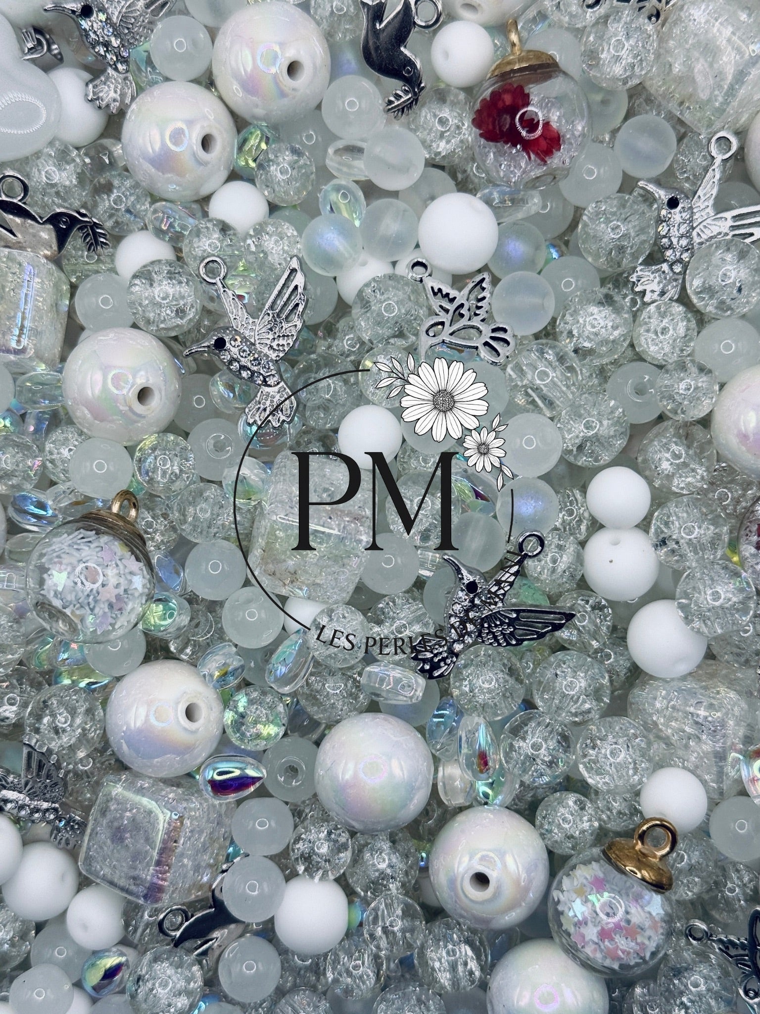 Ce mélange dévoile de somptueuses perles en verre craquelé et transparent, sublimées par de délicates nuances blanc pur, nacré et irisé, évoquant la douceur, la lumière et la pureté.