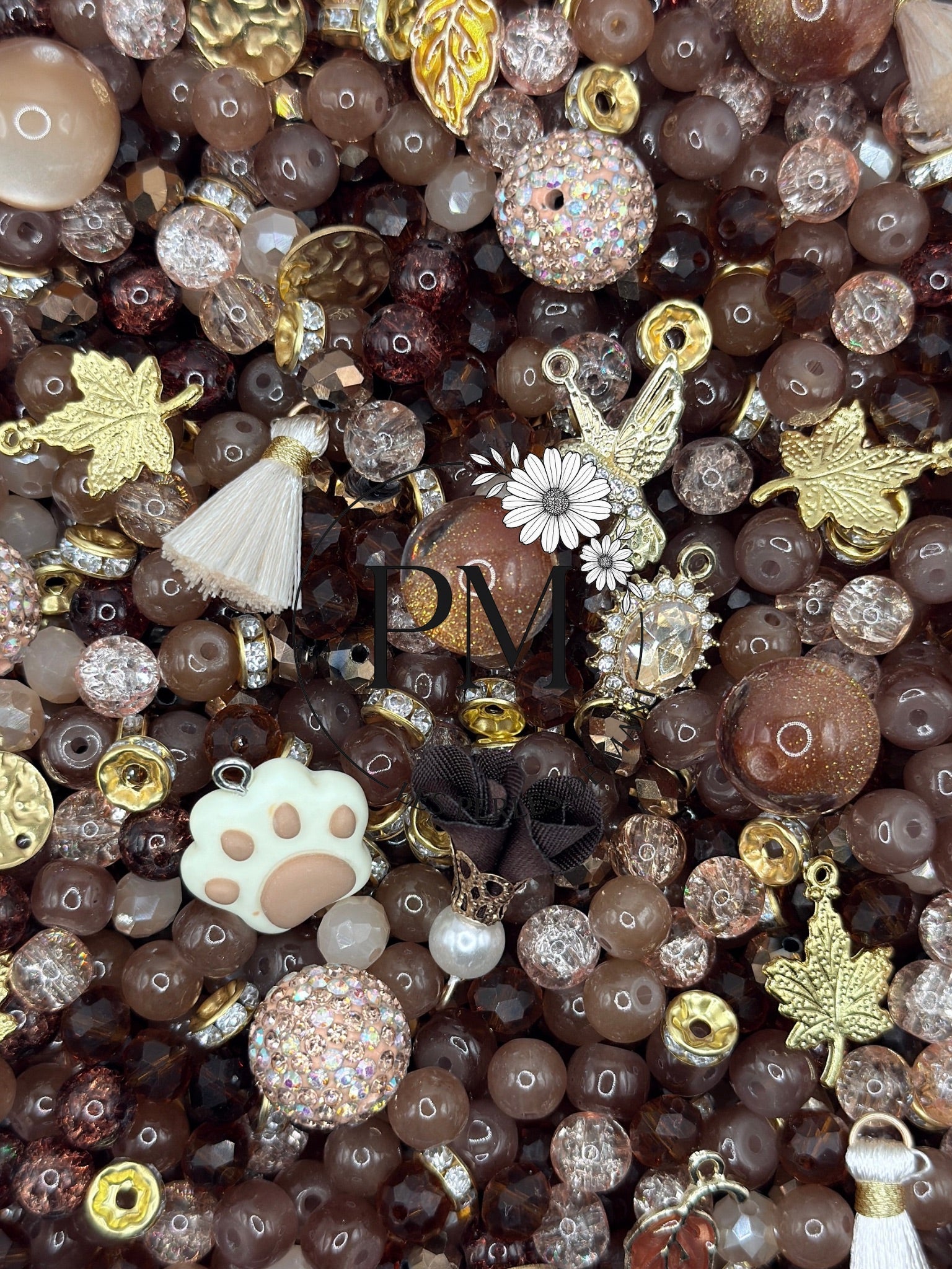 Ce mélange se compose de magnifiques perles en verre craquelé et facetté dans de chaleureux tons brun, chocolat, beige et caramel, accompagnées de perles unies assorties en 8 mm et 10 mm.