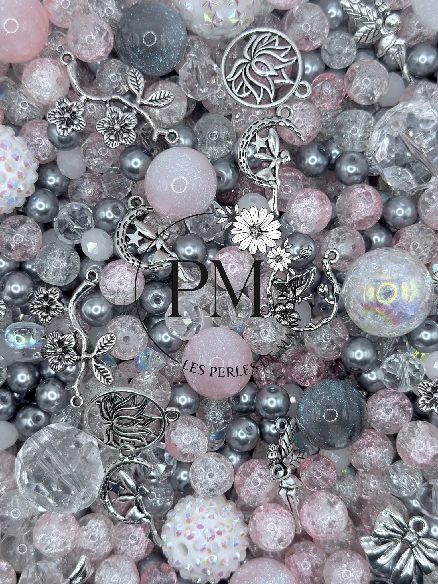 Ce mélange dévoile de sublimes perles aux nuances rose poudré, gris perle et argent doux, associées à des perles transparentes, craquelées et légèrement irisées, évoquant la tendresse et la magie féerique.