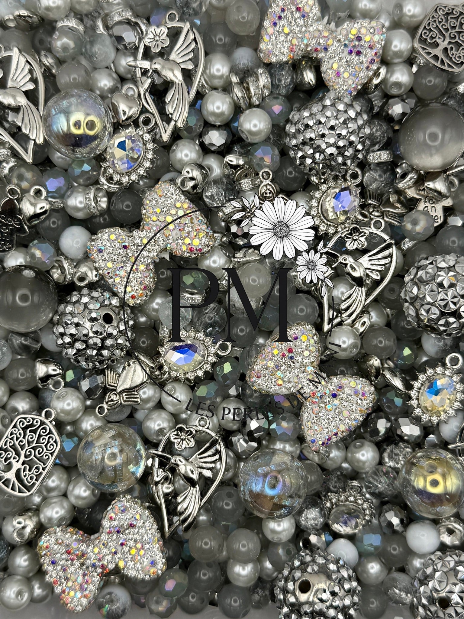 Ce mélange se compose de magnifiques perles en verre craquelé dans plusieurs nuances de gris, accompagnées de perles unies grises en 8 mm et 10 mm, ainsi que de perles à facettes qui ajoutent éclat et relief à l’ensemble.